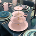 Die vierstöckige Etagere mit der Formnummer “611D” von Hedwig Bollhagen ist die große Schwester der dreistöckigen Version 611C. Formgebend für die beiden Etageren ist das offene Gestell mit verschiedenen, nach unten zunehmend breiter werdenden tellerförmigen Ebenen. Der durchgehende, alle Etagen verbindende Messingstab mit dem kreisrunden Griff an der Spitze rundet das Design elegant ab. Bei einer Höhe von 36 Zentimetern bietet der seit dem Barock so beliebte Tischaufsatz genügend Platz für Obst und Pralinen. Soviel steht fest, ob Erdbeeren, Kirschen oder Konfekt, auf der vierstöckigen Etagere von Hedwig Bollhagen lassen sich Früchte und Gebäck jeder Art stilvoll kredenzen.