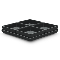 Die Platte von Hedwig Bollhagen mit der Formnummer „553“ ist den Mitarbeitern der Marwitzer Keramik-Manufaktur auch unter dem Namen „Kabarett-Tablett“ geläufig. Charakteristisch ist die quadratische Form. 24 Zentimeter lang und ebenso breit, gehört die ein Kilogramm schwere und zwei Zentimeter hohe Platte zu den ganz großen im Sortiment von Hedwig Bollhagen. Und flexibel in der Nutzung ist sie auch: In einem fünfteiligen Set lässt sich das quadratische Tablett nämlich mit vier kleineren, quadratischen Schalen kombinieren. Diese Servier-Platte ist nicht nur eine Allzweckwaffe, die sich im Alltag flexibel einsetzen lässt, sondern zieht auch sonst alle Blicke auf sich.