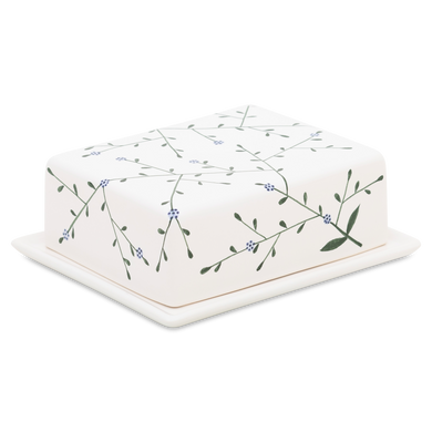 Fayence weiß blaue Blüten an grünem Stiel Glasur glänzend